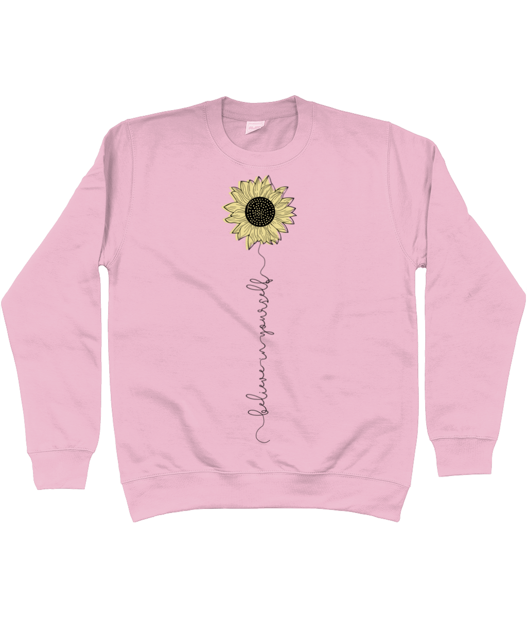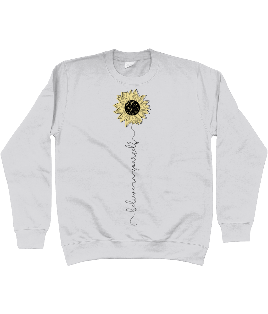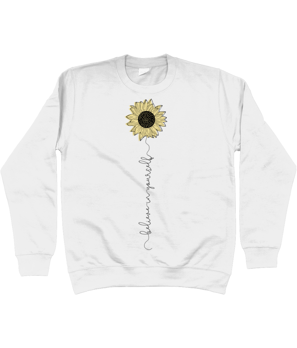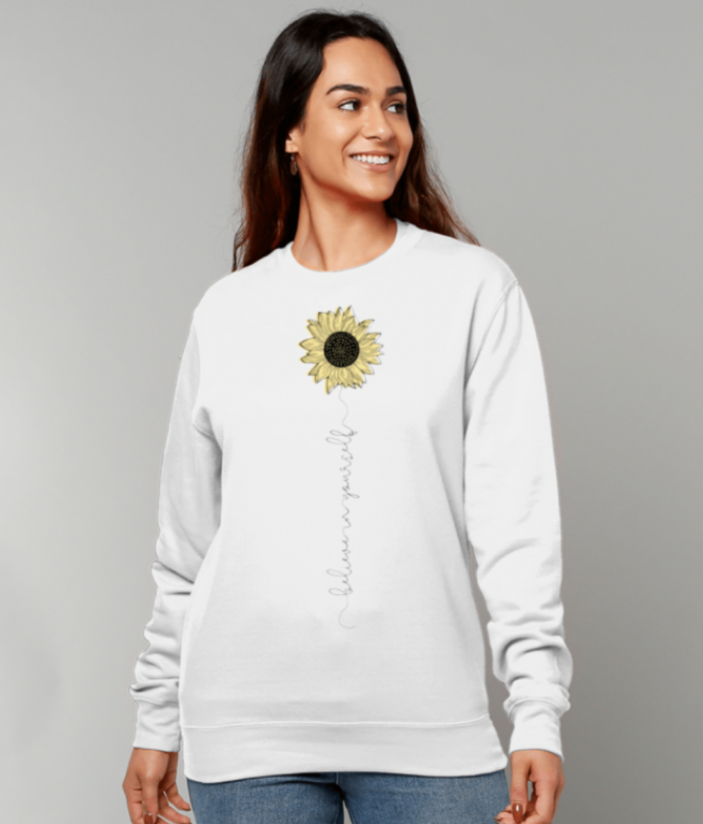 Design: Women’s sweatshirt with believe in yourself design on front.
